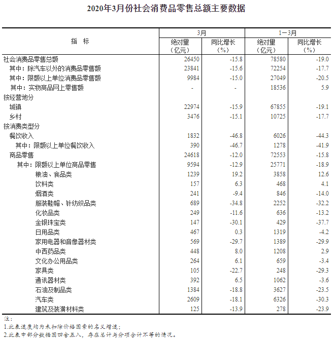 消費(fèi)方面,3月份,社會(huì)消費(fèi)品零售總額26450億元,同比下降15.8%(扣除價(jià)格因素實(shí)際下降18.1%,以下除特殊說明外均為名義增長),降幅比1-2月份收窄4.7個(gè)百分點(diǎn)。其中,除汽車以外的消費(fèi)品零售額23841億元,下降15.6%。