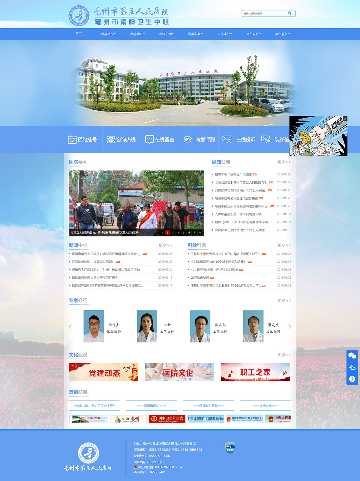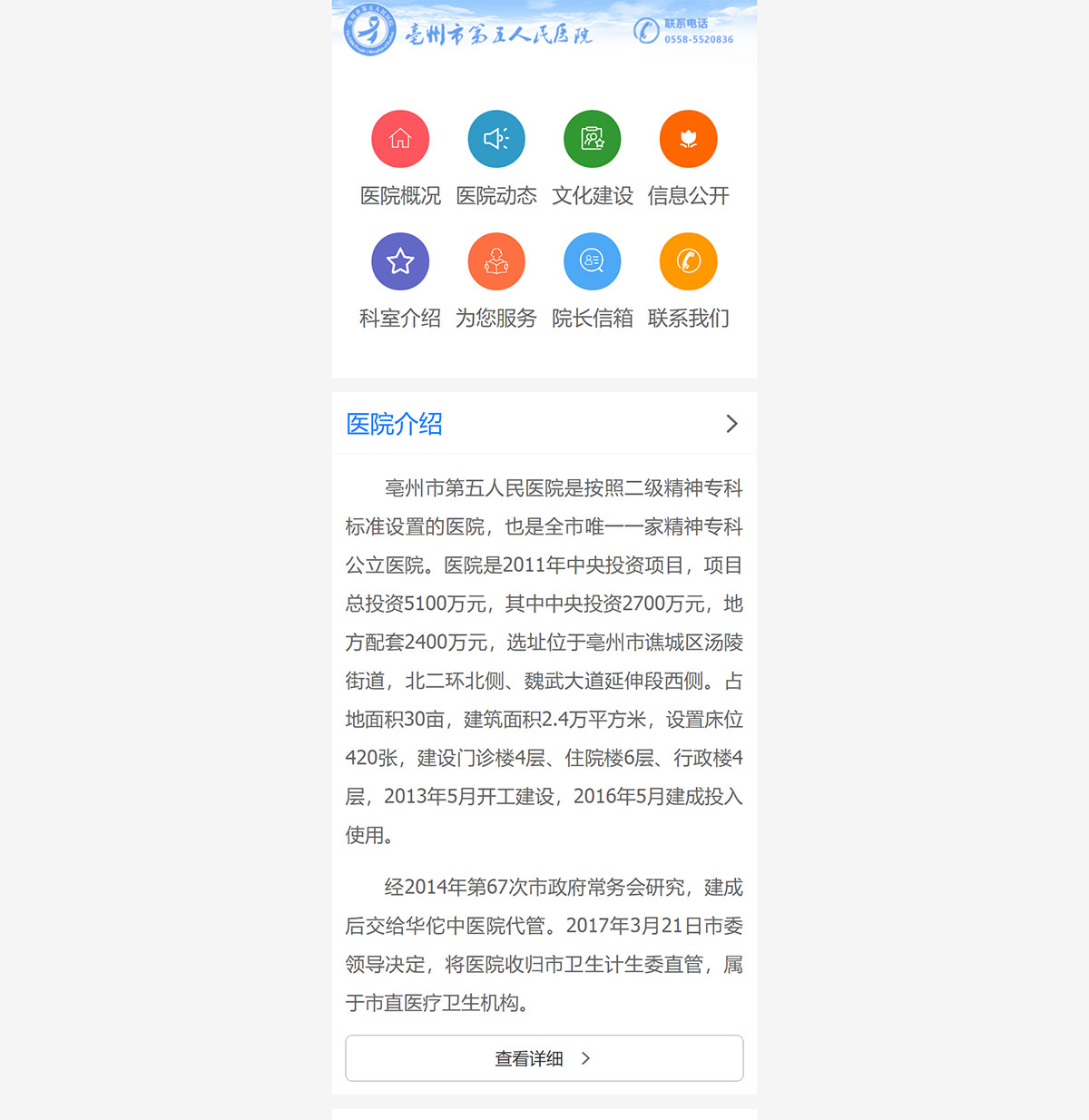 亳州市第五人民醫(yī)院是按照二級(jí)精神專科標(biāo)準(zhǔn)設(shè)置的醫(yī)院,也是全市唯一一家精神??乒⑨t(yī)院。醫(yī)院是2011年中央投資項(xiàng)目,項(xiàng)目總投資5100萬元,其中中央投資2700萬元,地方配套2400萬元,選址位于亳州市譙城區(qū)湯陵街道,北一環(huán)北側(cè)、魏武大道延伸段西側(cè)。占地面積30畝,建筑面積2.4萬平方米,設(shè)置床位420張,建設(shè)門診樓4層、住院樓6層、行政樓4層,2013年5月開工建設(shè),2016年5月建成投入使用。